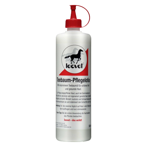 Leovet Tea Tree Care Lotion głęboko wnika, łagodzi i regeneruje podrażnioną skórę. Nawilża i chłodzi. Zmniejsza swędzenie. Korzystny efekt jest szczególnie przyjemny dla konia, może się zrelaksować. Stymuluje wzrost włosów, warstwa ochronna skóry jest ponownie stabilna i wzmocniona.