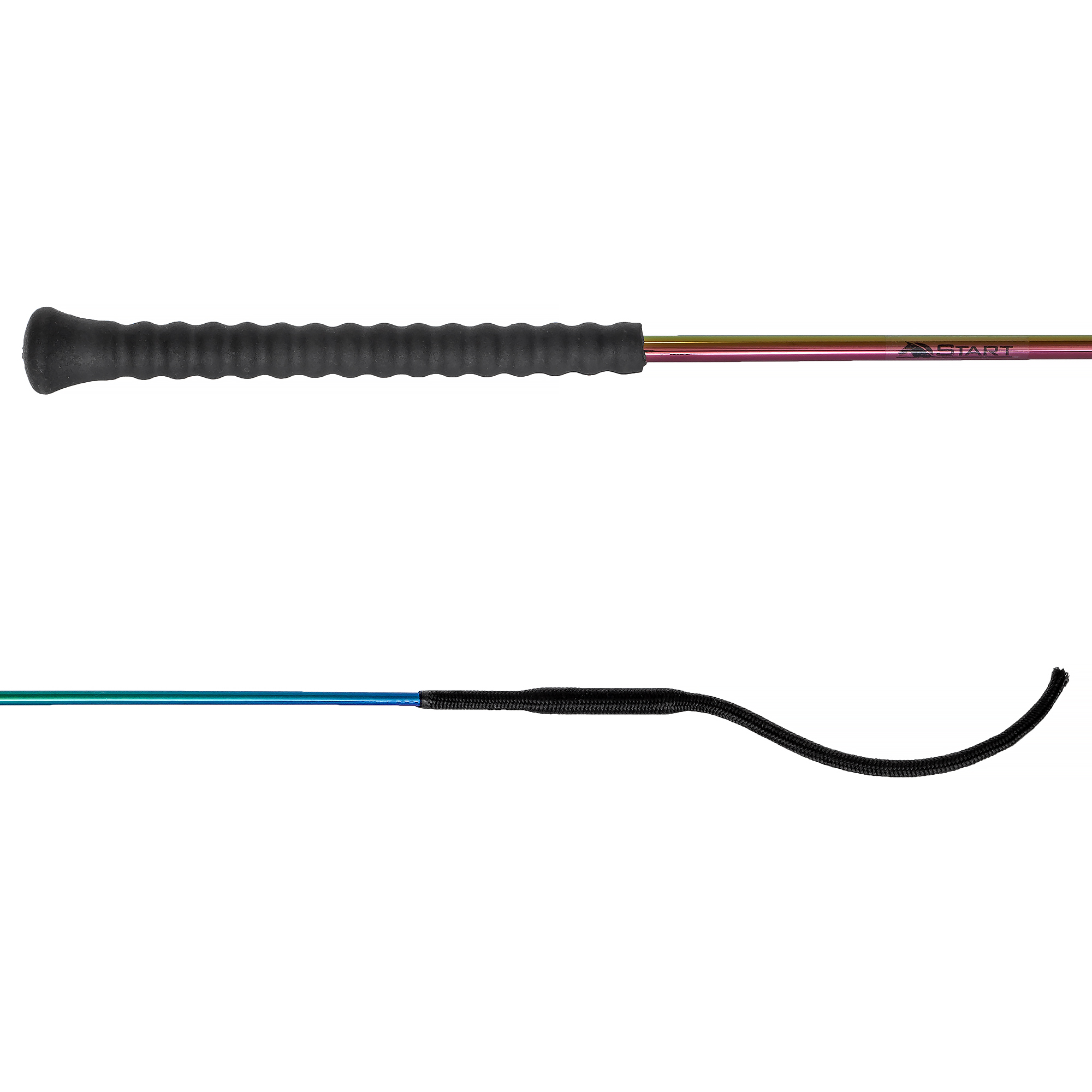 Bat ujeżdżeniowy w efektownym, holograficznym wykończeniu, które nadaje elegancki, nowoczesny charakter podczas treningów i startów. Smukła konstrukcja oraz odpowiednia długość umożliwiają precyzyjne i subtelne wspomaganie pomocy jeździeckich. Lekki i dobrze wyważony, zapewnia komfort użytkowania. Antypoślizgowa rączka gwarantuje stabilny chwyt, a elastyczny trzonek odpowiednią sprężystość w codziennej pracy z koniem.