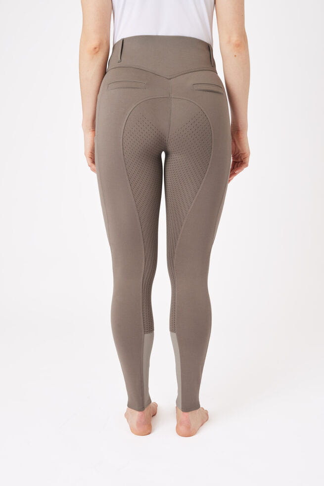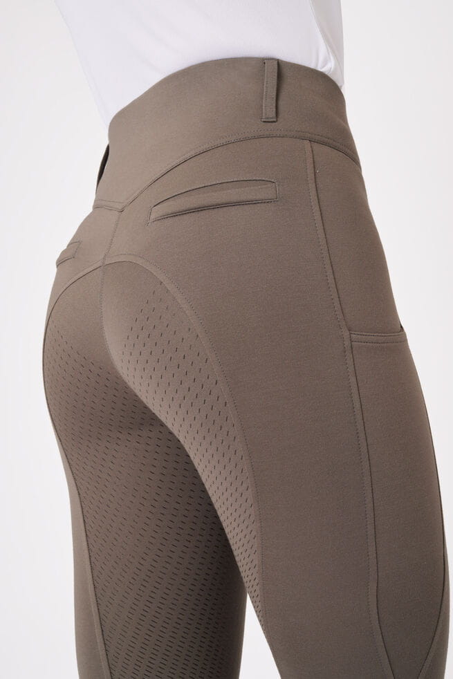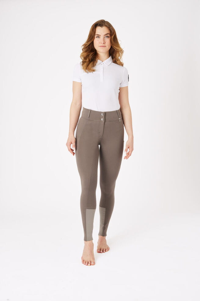 Bryczesy z pełnym lejem do codziennej jazdy. Ten model ma wysoki stan i wygodny, szeroki pas w talii.