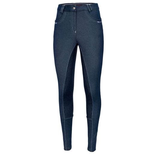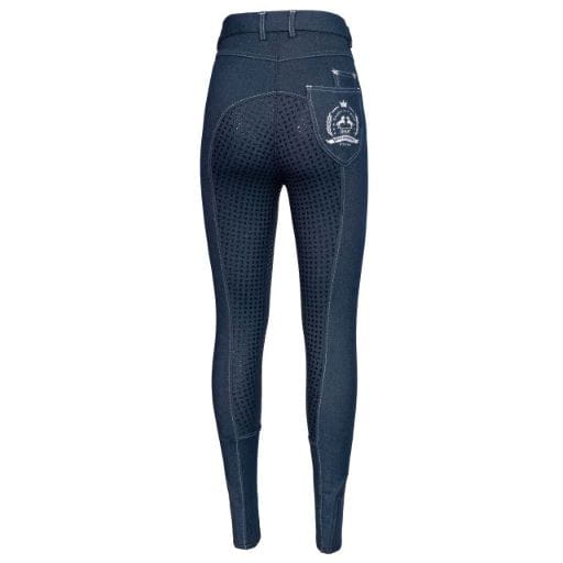Wygodne i stylowe legginsy jeździeckie z motywem denim, będą idealne dla kobiet ceniących sobie jakość wykonania i komfort użytkowania. Wykonane są z elastycznego materiału, dzięki czemu dobrze przylegają do sylwetki i zapewniają swobodę ruchów w czasie treningów lub prac stajennych. Posiadają pełny lej silikonowy, który ułatwi pewne utrzymanie się w siodle. Dzięki szlufkom na pasie, możesz wzbogacić stylizację swoim ulubionym paskiem, a kieszonki pozwolą na przechowywanie smakołyków dla Twojego konia. Elastyczne wstawki, którymi zakończone są nogawki umożliwiają wygodne zakładanie i lepsze układanie się spodni na ciele. Uroku dodają im kontrastowe przeszycia oraz haft na tylnej kieszonce.