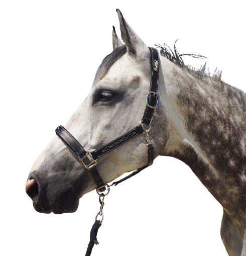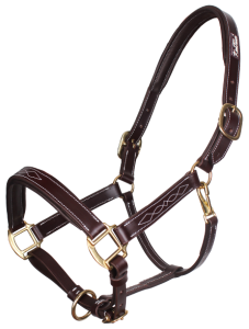 Luksusowy skórzany kantar z wyściółką i ozdobnymi przeszyciami.
