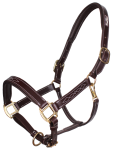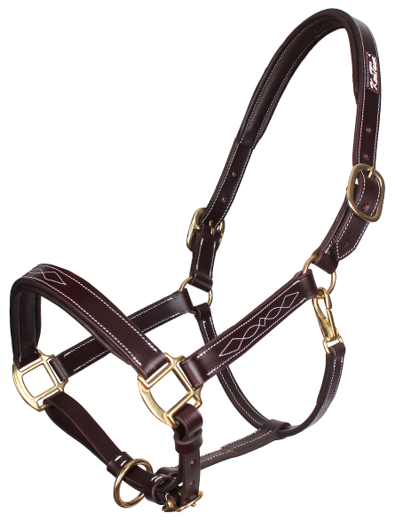 Luksusowy skórzany kantar z wyściółką i ozdobnymi przeszyciami.