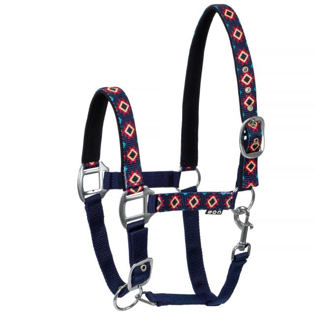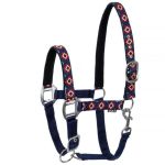 Kolorowy kantar z ciekawym wzorem, wykonany z solidnej, parcianej taśmy.