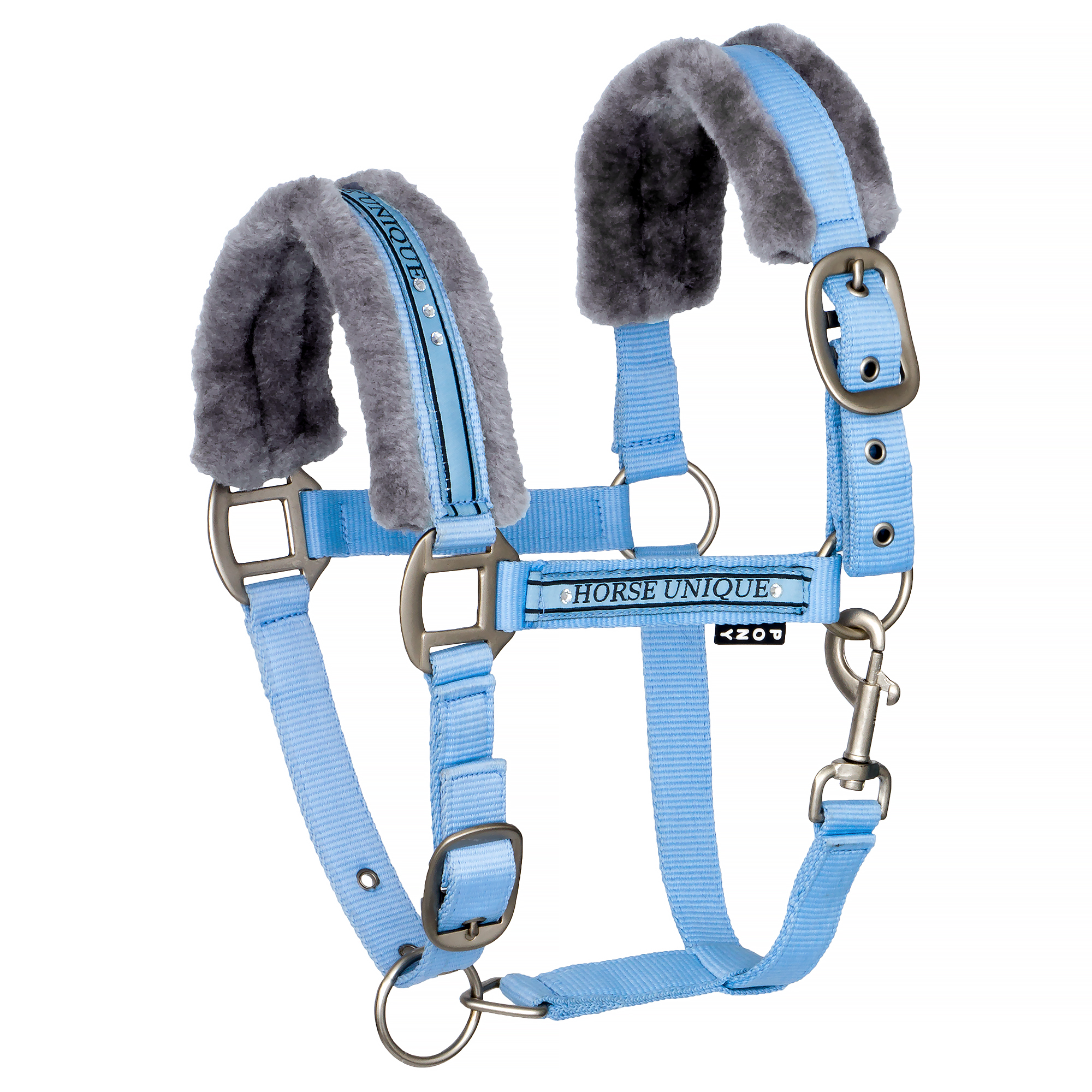 Elegancki kantar ozdobiony cyrkoniami na nachrapniku oraz paskach bocznych. Nachrapnik oraz potylica podszyte zostały miękkim futerkiem. Posiada podwójną regulację.