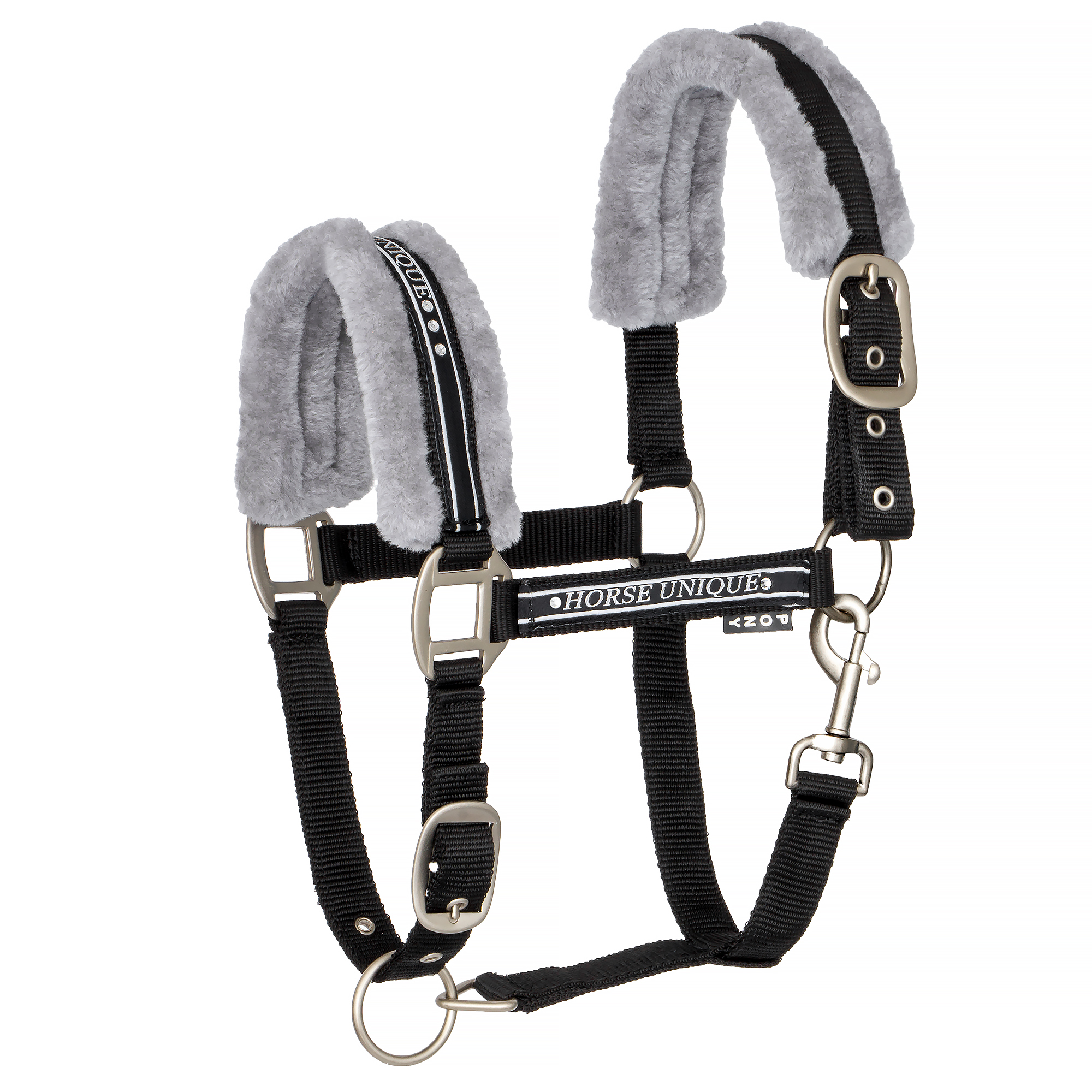 Elegancki kantar ozdobiony cyrkoniami na nachrapniku oraz paskach bocznych. Nachrapnik oraz potylica podszyte zostały miękkim futerkiem. Posiada podwójną regulację.