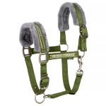 Elegancki kantar ozdobiony cyrkoniami na nachrapniku oraz paskach bocznych. Nachrapnik oraz potylica podszyte zostały miękkim futerkiem. Posiada podwójną regulację.