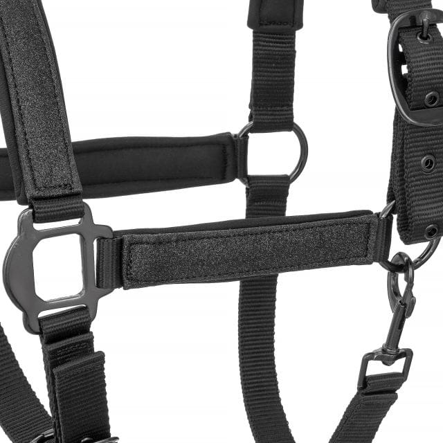 Brokatowe elementy magiczne mienią się w świetle, co nadaje kantarowi wyjątkowego charakteru, który dodatkowo podkreślają eleganckie, czarne okucia.