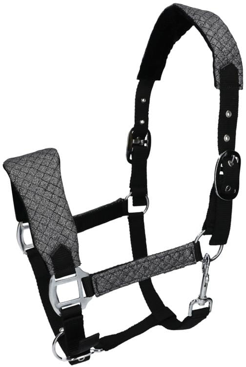 Kantar wykonany z podwójnej nylonowej taśmy. Posiada podwójną regulację oraz miękkie podszycie z weluru w części potylicznej i nachrapnikowej. Z zewnętrznej strony materiał jest błyszczący, brokatowy.