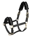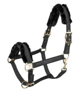 Ekskluzywny kantar z eleganckim satynowym wykończeniem i okuciami w kolorze złota. Nachrapnik i potylica podszyte są miękkim, syntetycznym futerkiem, które zapewnia wyjątkowy komfort noszenia. Idealnie pasuje do derki z kolekcji Exclusive.