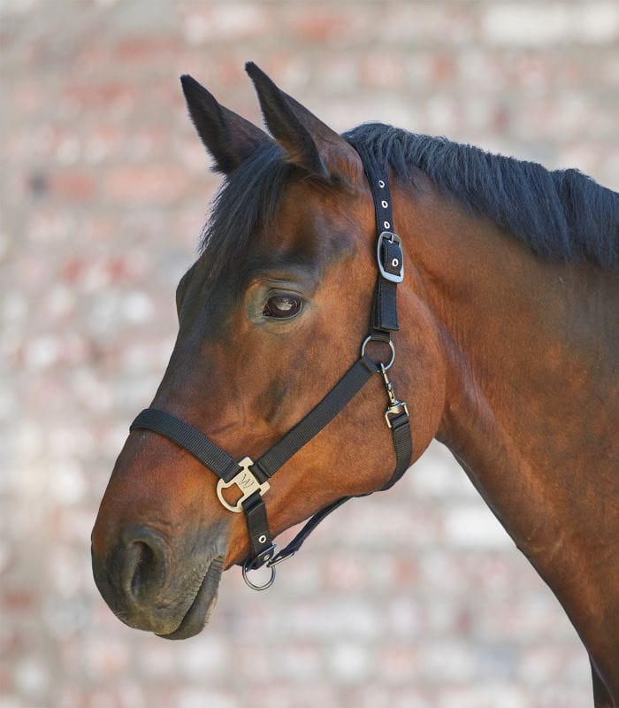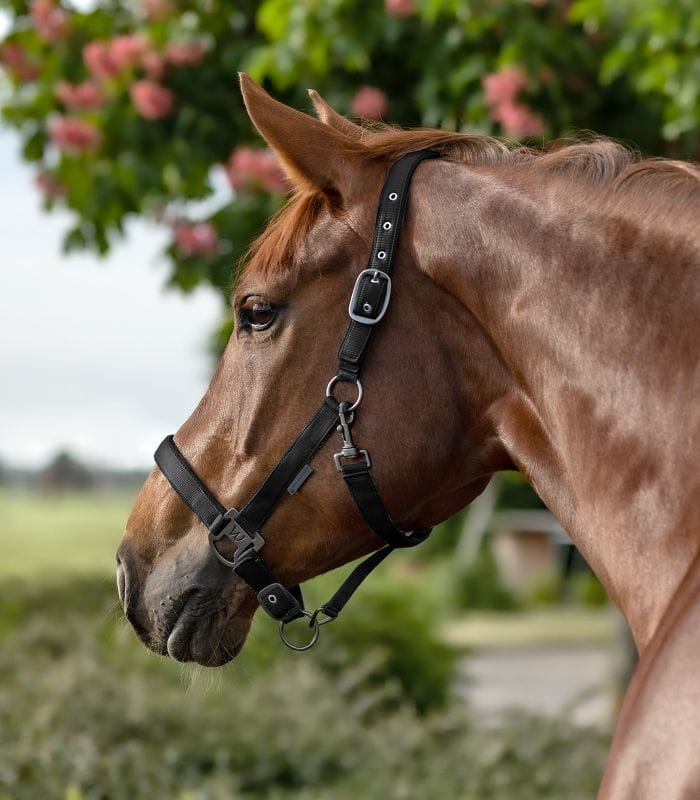 Miękko podszyty kantar z matowymi, ciemnymi okuciami. Regulowany w kilku miejscach – na pasku potylicznym (z jednej strony) oraz pod brodą, co zapewnia optymalne dopasowanie. Idealnie komponuje się z uwiązami Gloomy nr 50486 i 50487.