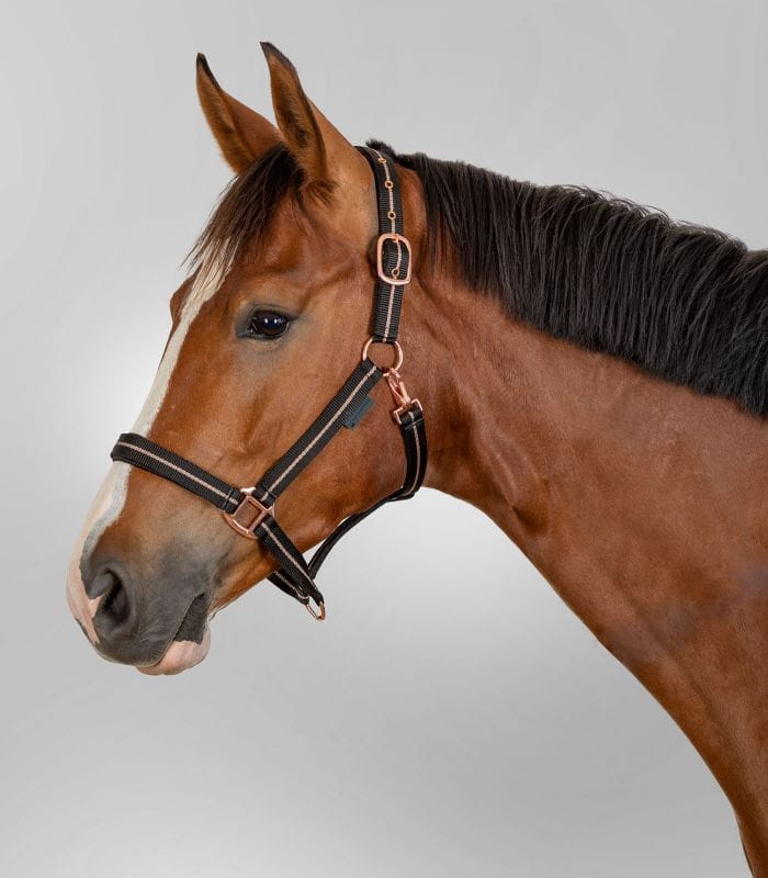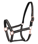 Stylowy kantar z miękkim podszyciem, ozdobnym przeszyciem i eleganckimi okuciami w kolorze różowego złota. Regulowany jednostronnie na pasku potylicznym, co pozwala na wygodne dopasowanie. Świetnie komponuje się z uwiązem Rosé z tej samej serii.