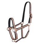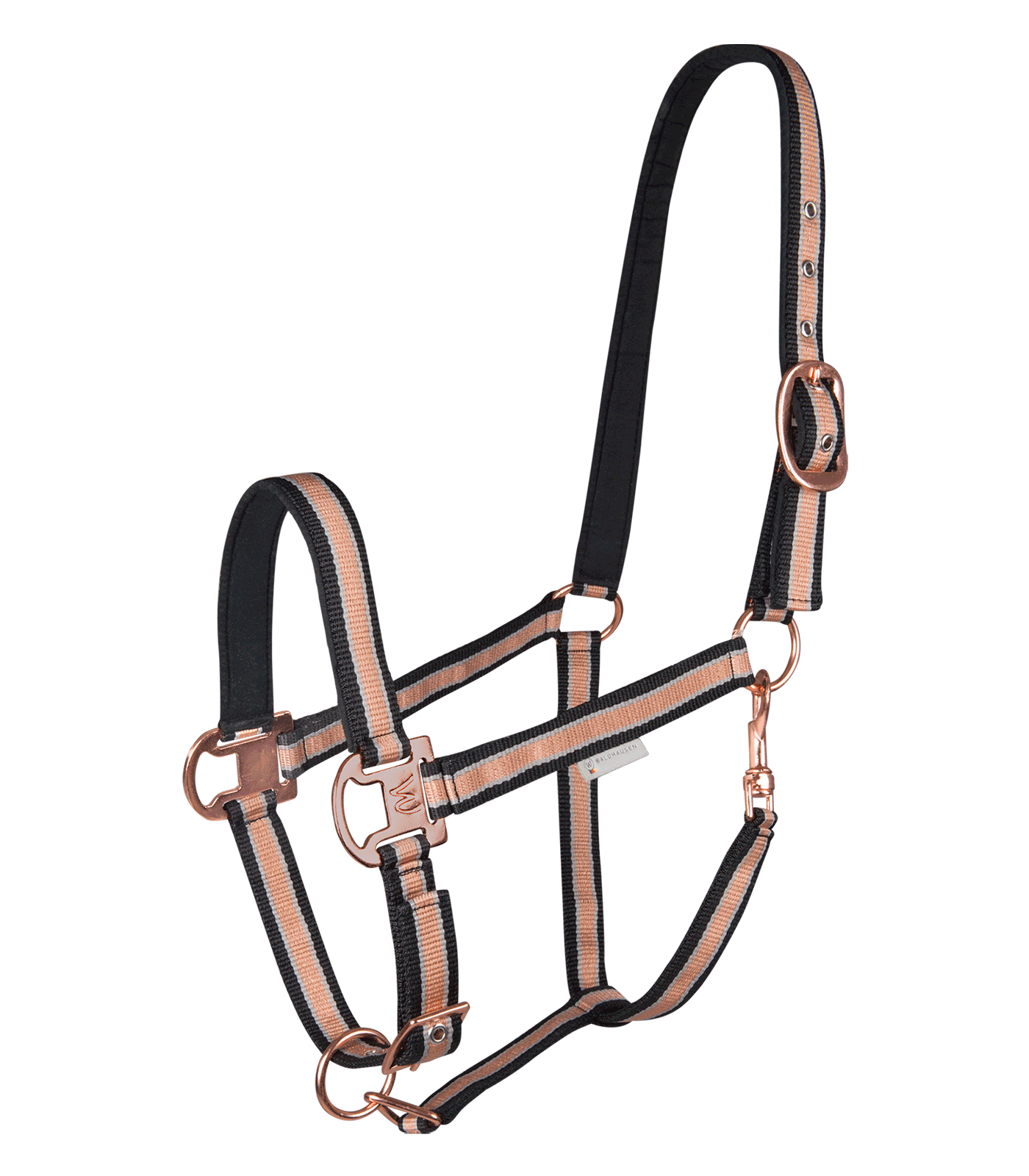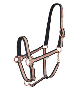 Stylowy kantar z miękkim podszyciem i eleganckimi okuciami w kolorze różowego złota. Regulacja w kilku miejscach – na pasku potylicznym (z jednej strony) oraz pod brodą – pozwala na idealne dopasowanie do głowy konia. Świetnie komponuje się z uwiązami Shine, art. 50489 i 50490.
