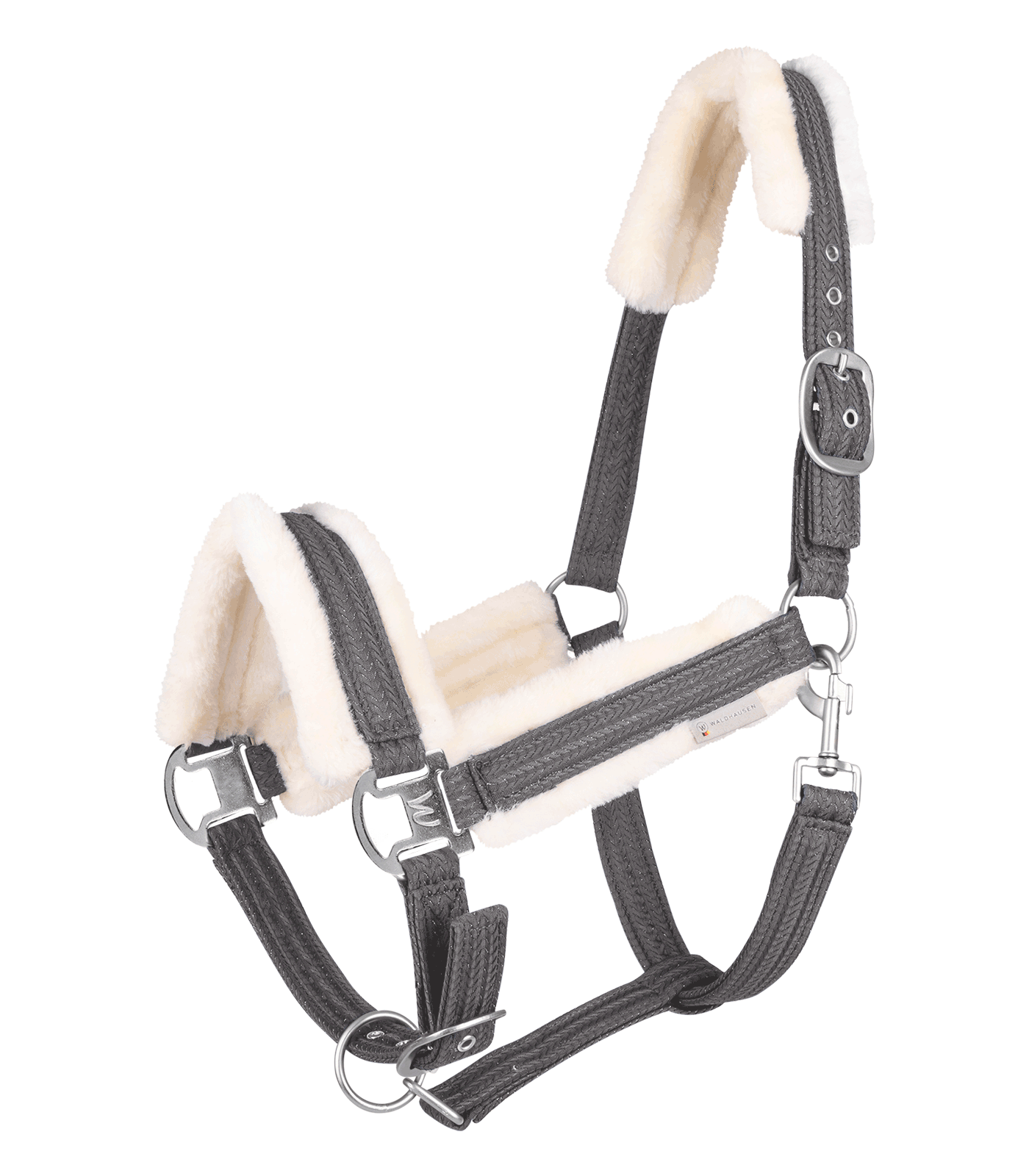 Puszysty kantar z charakterystyczną sprzączką Waldhausen, idealny dla koni ceniących komfort. Miękkie, syntetyczne futerko na potylicy, nachrapniku i paskach policzkowych chroni przed obtarciami. Regulacja na pasku potylicznym (z jednej strony) oraz pod brodą pozwala na łatwe dopasowanie.