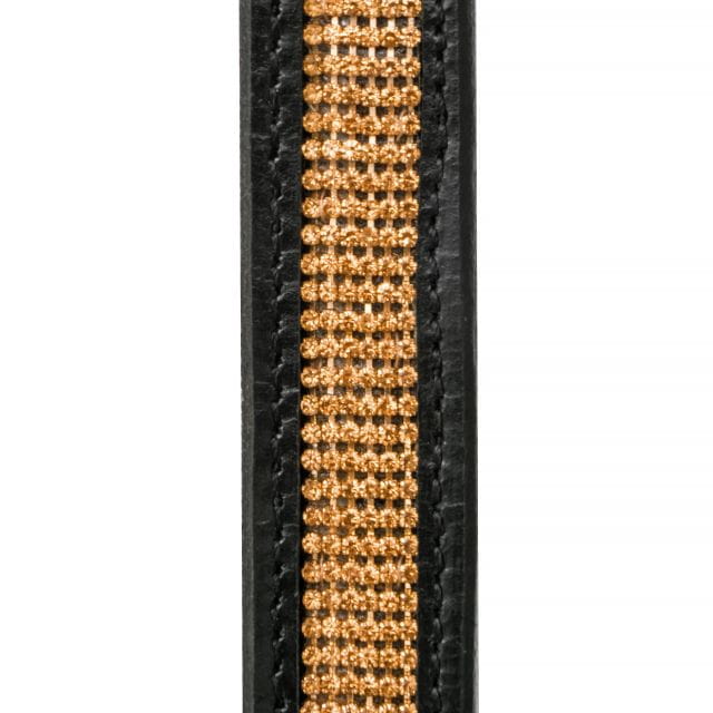 Elegancki, wykonany z wysokiej jakości skóry, miękko podszyty, przepiękne zdobienia w postaci diamencików w kolorze rosegold, okucia w kolorze różowego złota, regulowany po obu stronach głowy.