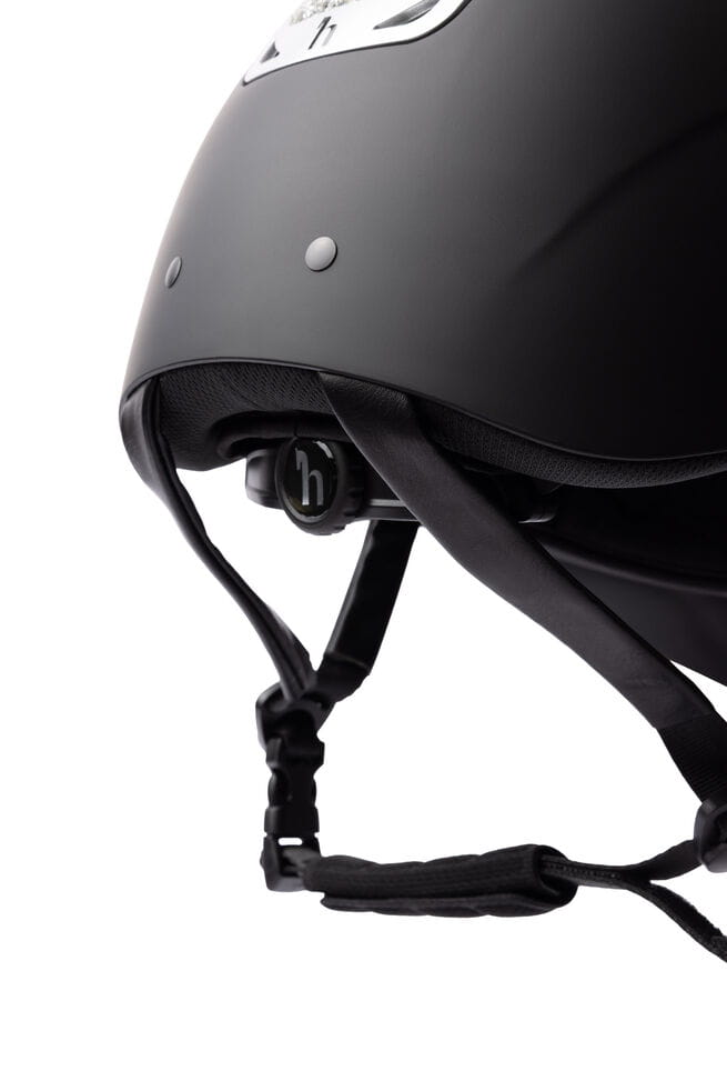 Kask Horze Arix II jest odporny na duże uderzenia, a otwory wentylacyjne zapewniają wygodę dzięki dużej ilości powietrza, które zapewnia chłód głowy. Kryształowe panele z brokatem na zewnętrznej skorupie kasku dodają elegancji Twojemu strojowi do jazdy konnej i są dostępne w różnych stylowych kolorach. Szeroki wizjer zapewnia dodatkową osłonę. System pokręteł pozwala dostosować go do idealnego dopasowania. Wyściółka z pianki zapamiętującej kształt otula głowę, zapewniając jednocześnie ochronę w razie upadku. Elastyczny brzeg daszka zwiększa bezpieczeństwo.