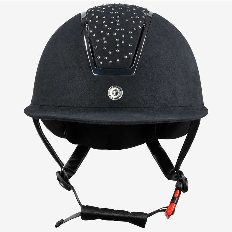 Kask Horze Solara to standardowy VG1 z wieloma dodatkowymi funkcjami. Otwory wentylacyjne z przodu, na górze i z tyłu zapewniają doskonały przepływ powietrza, co oznacza, że będziesz mogła się zrelaksować i skupić, nie martwiąc się spoconą głową. Wyjątkowo szeroki daszek zapewnia ochronę oczu i zapobiega oślepianiu przez słońce. Podszewka wykonana jest z memory foam, która dopasowuje się do kształtu głowy i zapewnia zwiększony komfort. Wewnętrzny system mocowania „dial” zapewnia idealne dopasowanie i zapobiega przesuwaniu się kasku. Pasek na podbródek jest tak zaprojektowany, aby chronić szyję i jest wyściełany w celu zapewnienia bezpiecznego i wygodnego dopasowania. Szybko odpinająca się sprzączka to kolejny sprytny akcent. Atrakcyjny design z wyróżniającymi się kryształkami oznacza, że możesz jeździć w świetnym stylu!
