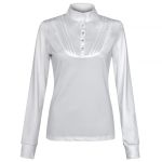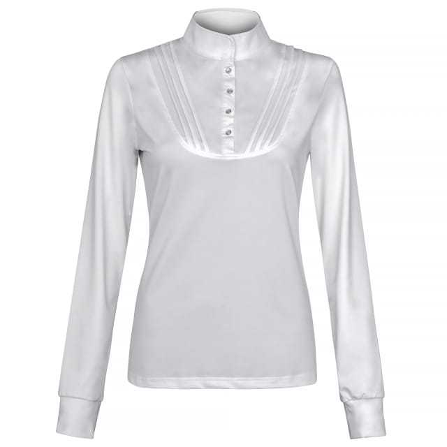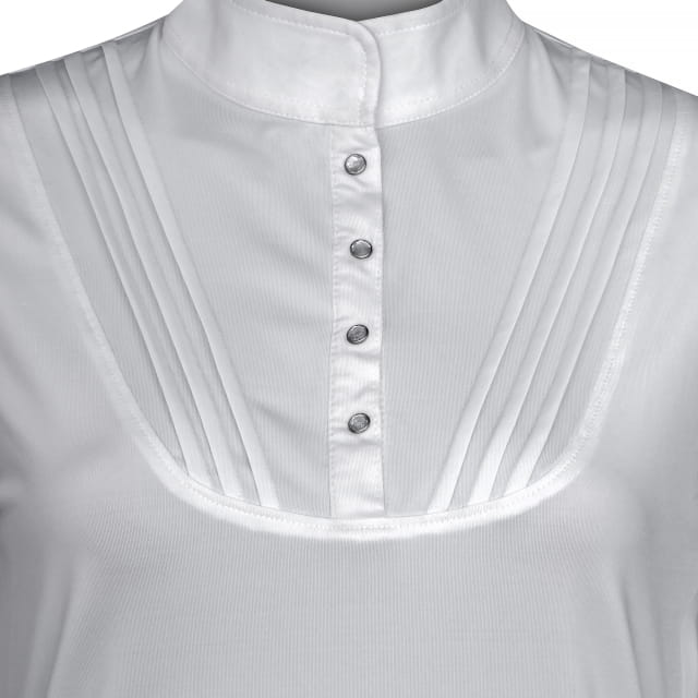 Klasyczna koszulka konkursowa. Uszyta z technicznego materiału, przyjemnego w dotyku. Zdobiona charakterystycznymi pliskami. Zapinana na zatrzaski, z kryształkami.
