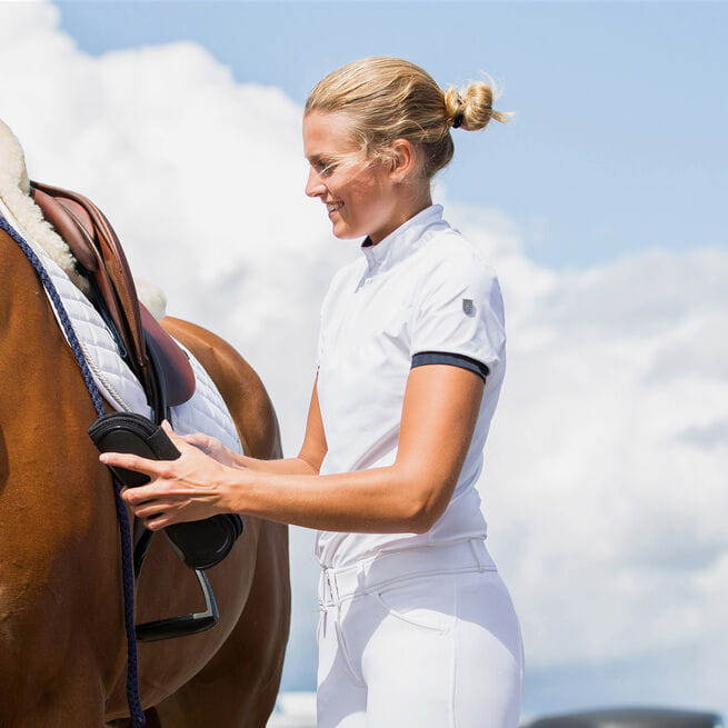 Koszulka jest idealna na zawody, a dzięki wywijanemu kołnierzykowi może być noszona rozpięta podczas codziennego treningu. Tkanina siatkowa na wysokości klatki piersiowej i pleców umożliwia dodatkowy przepływ powietrza i zwiększa jej funkcjonalność. Zamek błyskawiczny jest łatwy w użyciu i umożliwia szybkie zapinanie i rozpinanie. Koszulka ma sportowy, acz kobiecy krój, idealnie nadaje się na różne okazje. Tkanina jest miękka, ale wytrzymała, co sprawia, że jest idealna dla aktywnych jeźdźców.