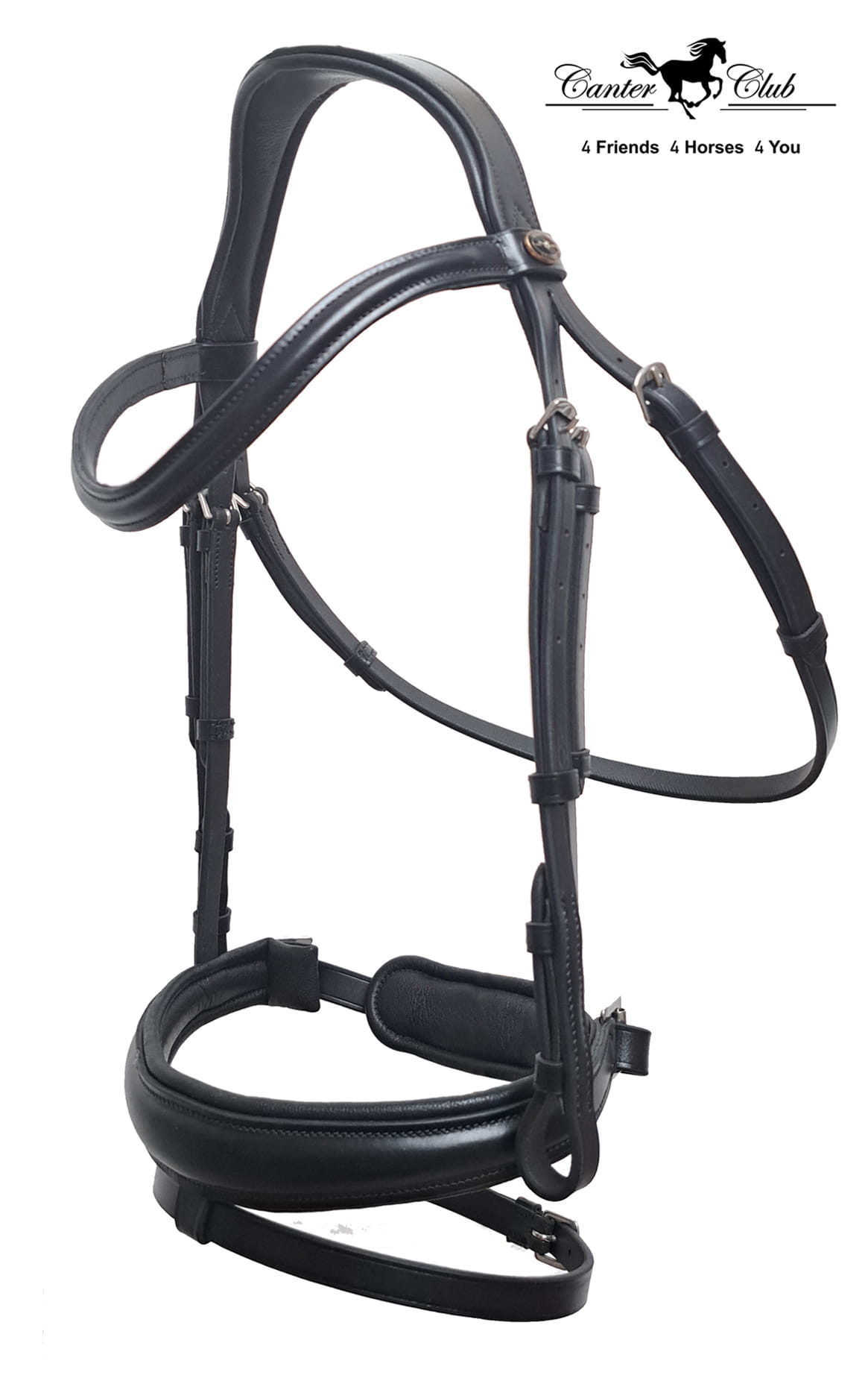 Ogłowie Canter Club MIRABILIS z nachrapnikiem "szwedzkim" to dobry wybór dla jeźdzców, którzy chcą precyzyjnie prowadzić swoje konie oraz dla wrażliwych i delikatnych koni, które wymagają stabilnego umocowania nachrapnika. Wygląd ogłowia odpowiada aktualnym trendom. Elegancję i efektowny wygląd zapewnia szeroki, matowy, zwężający się ku podgardlu nachrapnik oraz lekko opadający naczółek CRISTALLUS . Najwyższy komfort użytkowania ogłowia uzyskano dzięki : - wykonaniu z wysokiej jakości skóry - miękkiemu podszyciu części nosowej oraz potylicznej - anatomicznemu kształtowi część potylicznej - nachrapnikowi zaciskowemu z rolkowymi sprzączkami, umożliwiającymi dokładną regulację dopięcia, wyposażonemu w pasek krzyżowy ( skośnik ) - okuciom wykonanym ze stali nierdzewnej w kolorze srebrnym Ogłowie w komplecie z wodzami parcianymi ze stoperami. Dostępne w rozmiarach Cob i Full w kolorze czarnym.