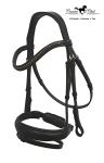 Ogłowie Canter Club MIRABILIS z nachrapnikiem "szwedzkim" to dobry wybór dla jeźdzców, którz chcą precyzyjnie prowadzić swoje konie oraz dla wrażliwych i delikatnych koni, któe wymagają stabilnego umocowania nachrapnika. Wygląd ogłowia odpowiada aktualnym trendom. Elegancję i efektowny wygląd zapewnia szeroki, matowy, zwężający się ku podgardlu nachrapnik oraz lekko opadający naczółek CRISTALLUS . Najwyższy komfort użytkowania ogłowia uzyskano dzięki : - wykonaniu z wysokiej jakości skóry - miękkiemu podszyciu części nosowej oraz potylicznej - anatomicznemu kształtowi część potylicznej - nachrapnikowi zaciskowemu z rolkowymi sprzączkami, umożliwiającymi dokładną regulację dopięcia, wyposażonemu w pasek krzyżowy ( skośnik ) - okuciom wykonanym ze stali nierdzewnej w kolorze srebrnym Ogłowie w komplecie z wodzami parcianymi ze stoperami. Dostępne w rozmiarach Cob i Full w kolorze czarnym.