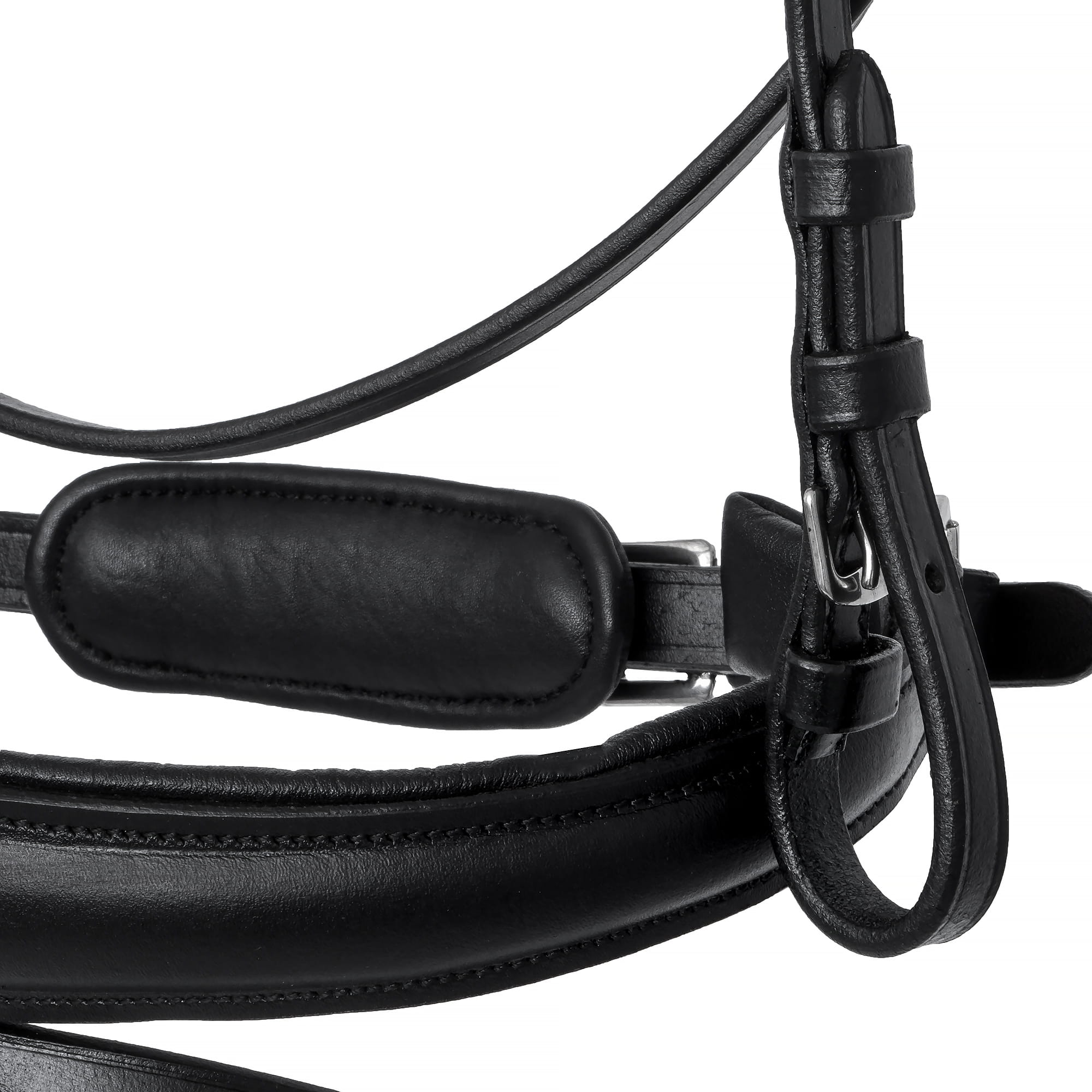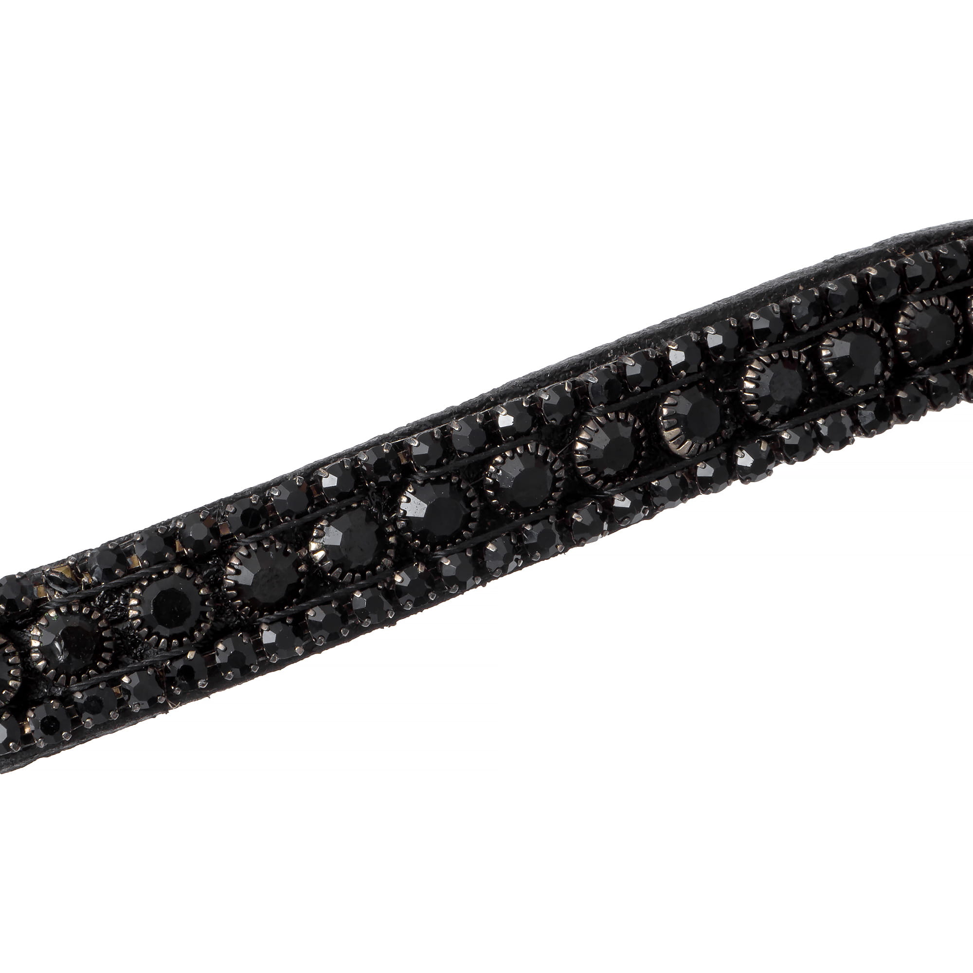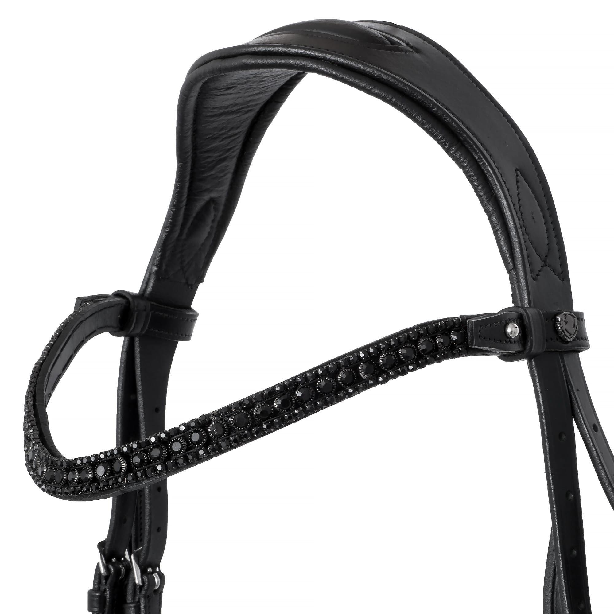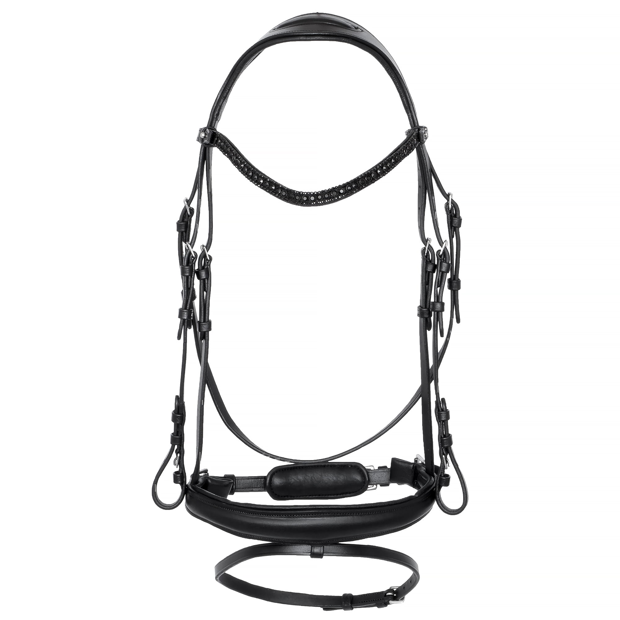 wykonane z wysokiej jakości skóry naturalnej, anatomicznie wyprofilowany nagłówek dla maksymalnego komfortu konia, miękko podszyty nachrapnik i potylica, naczółek ozdobiony błyszczącymi kryształkami Solidne, metalowe okucia w kolorze srebrnym Klasyczny, elegancki design w głębokiej czerni