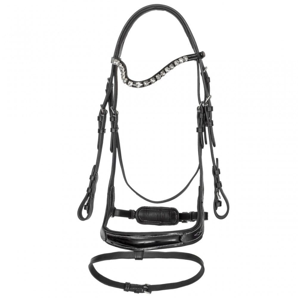 Ogłowie wykonane z wysokiej jakości skóry z anatomicznym, lakierowanym nachrapnikiem.