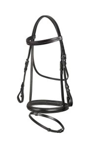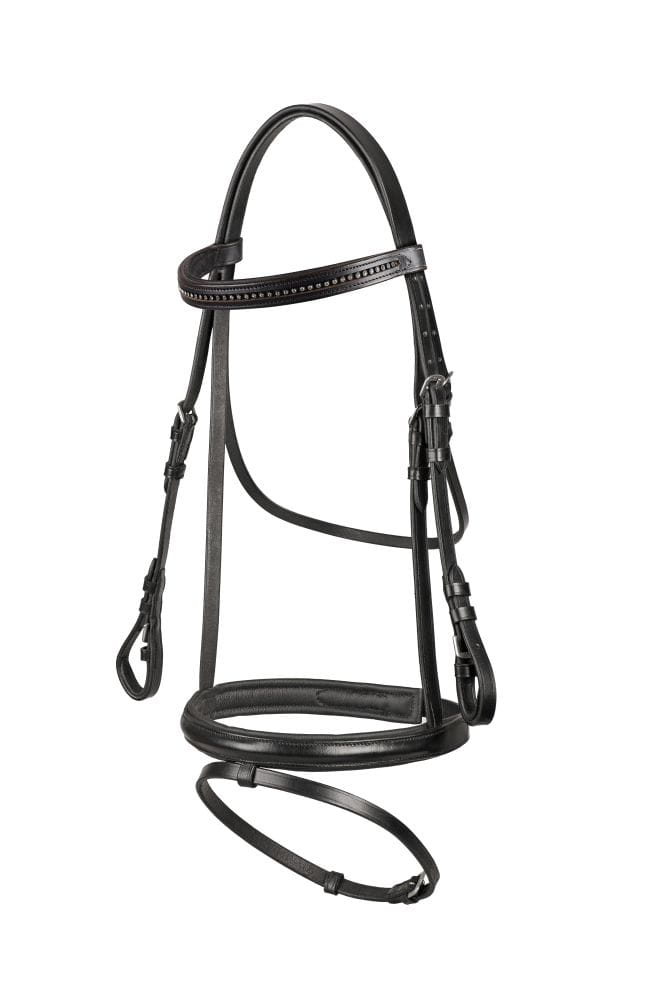 Ogłowie z nachrapnikiem angielskim kombinowanym w kolorze czarnym. Wykonane z dobrej jakości skóry, miękko podszyte na nachrapniku. Wyposażone w miękko podszyty, prosty naczółek z kryształkami. Elementy metalowe wykonane ze stali nierdzewnej. W zestawie z wodzami parcianymi o szerokości 19 mm.