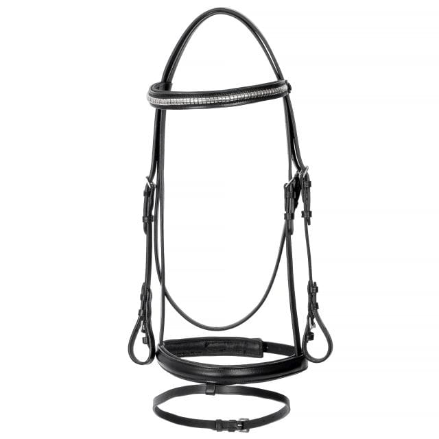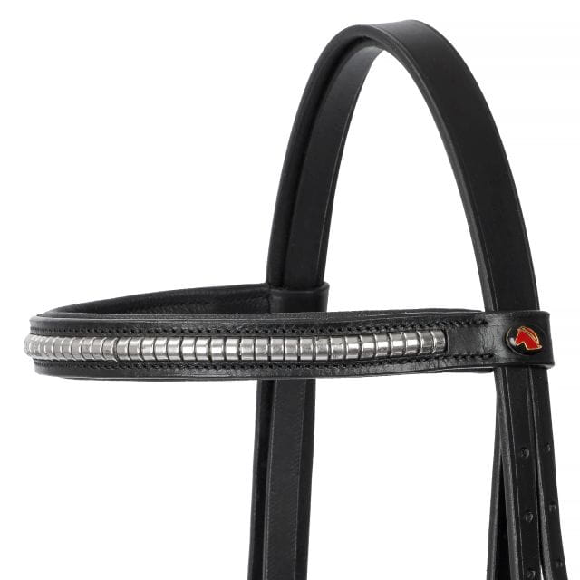 Klasyczne, eleganckie ogłowie z subtelnymi zdobieniami na naczółku, w postaci pasma małych, srebrnych kwadratów.