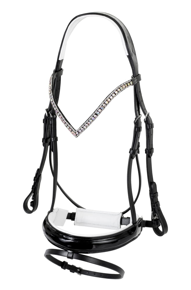 Naczółek opada w kształcie litery "V" i ozdobiony jest diamentami.