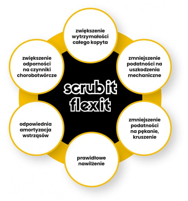 scrub it & flex it to terapeutyczna seria produktów przeznaczona do kompleksowej pielęgnacji kopyt: