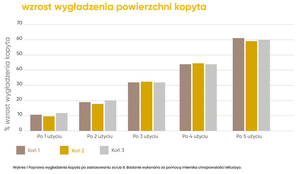 Skuteczność preparatu scrub it potwierdzono badając zmianę wygładzenia powierzchni kopyta za pomocą miernika chropowatości. Badanie wykonano u 3 koni w wieku 4, 10 i 16 lat. Preparat stosowano raz w tygodniu przez 5 tygodni. Wyniki odniesiono do stanu pierwotnego kopyta. Po tym okresie zaobserwowano znaczący wzrost wygładzenia powierzchni kopyta (ponad 60%), zmniejszenie ilości wgłębień, rys i powierzchniowych spękań.