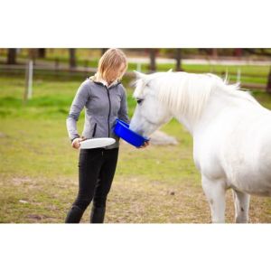 Pojemnik do paszy jest prostym oraz wygodnym rozwiązaniem do przechowywania paszy w stajni oraz na wyjeździe. Charakteryzuje się stabilością nawet przy ustawianiu kilku pojemników na sobie. Sprzedawany jest w zestawie z pokrywką.
