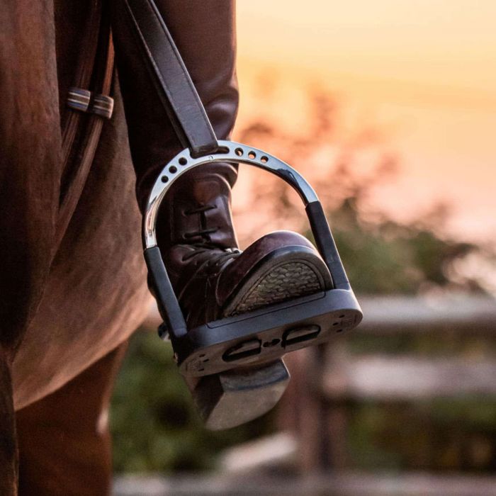• Nowoczesny design, topowy model strzemion w eleganckim kolorze srebrno-czarnym.