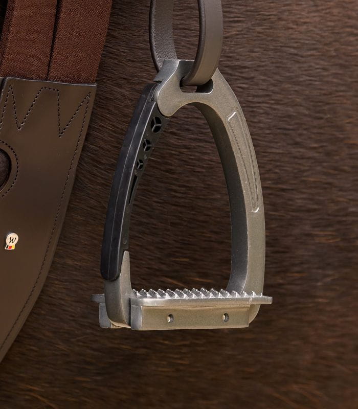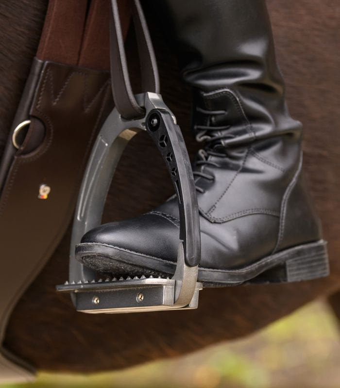 Nowoczesne strzemiona wykonane z wysokiej jakości aluminium, stworzone z myślą o maksymalnym bezpieczeństwie jeźdźca. Posiadają szeroką stopkę (6,5 cm x 12 cm), która zapewnia stabilne oparcie i komfort podczas jazdy. Zewnętrzny zawias otwiera się pod wpływem ciężaru jeźdźca w razie upadku, zapobiegając zaklinowaniu nogi w strzemieniu.
