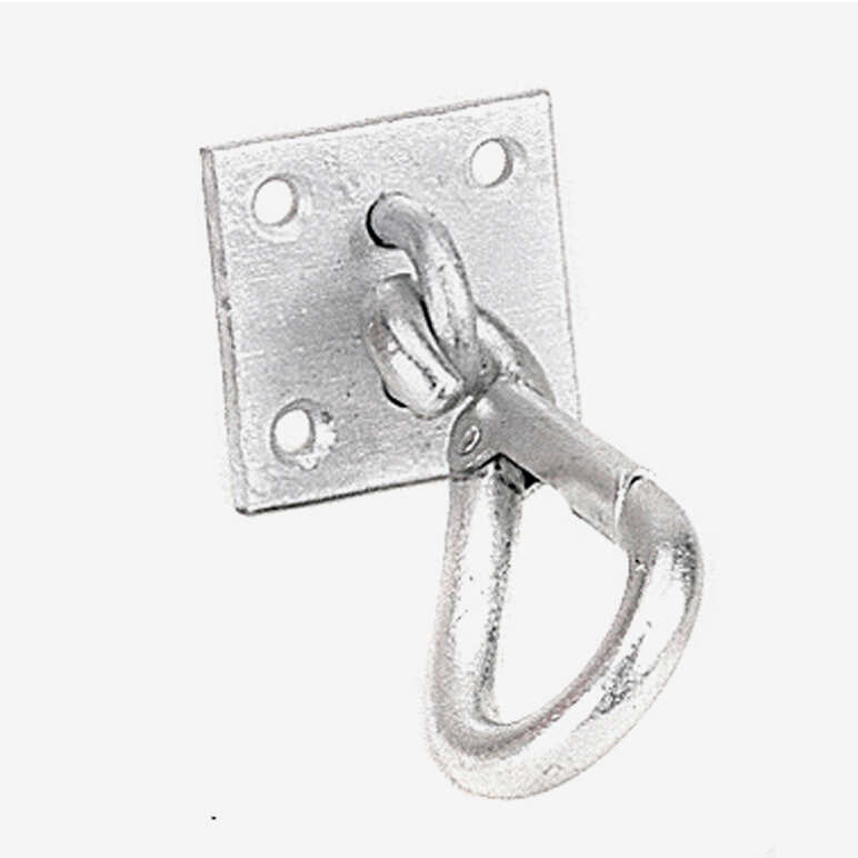 Prosty i praktyczny uchwyt do wiadra: metalowa płytka z szybko otwieranym karabińczykiem. Do zamocowania na ścianie stajni lub zewnętrznej stronie przyczepy za pomocą 4 śrub.