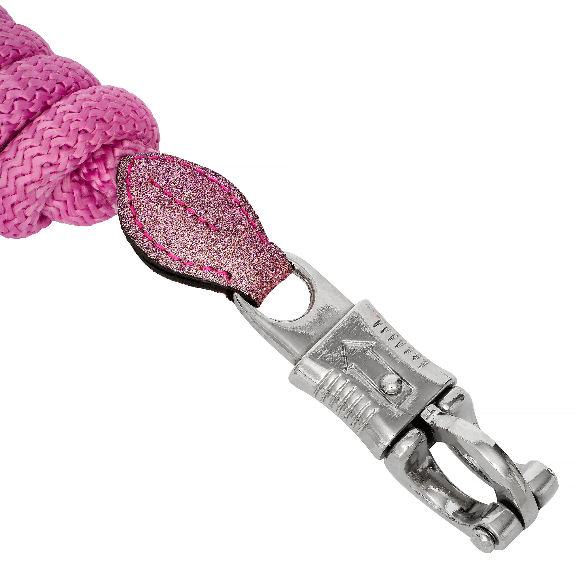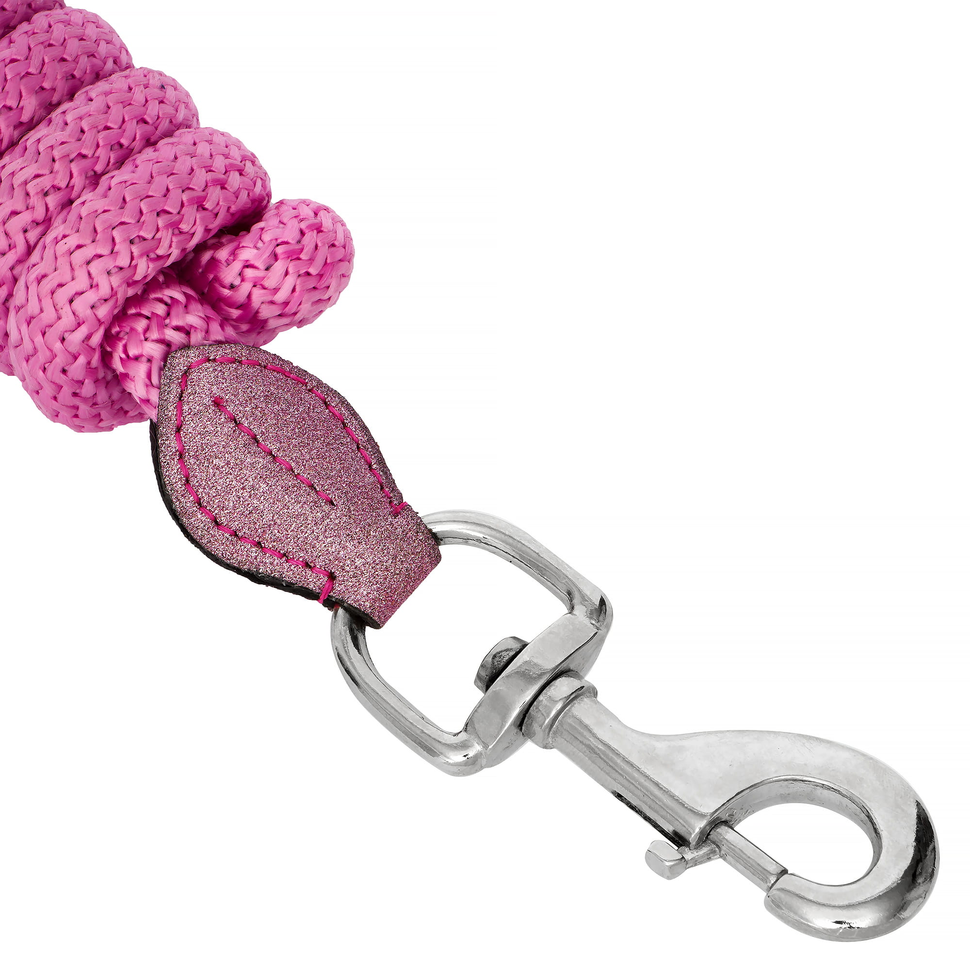 Dzięki dekoracyjnym, połyskującym nitkom uwiąz ma efektowny, „glitterowy” wygląd, który doskonale komponuje się z nowoczesnymi akcesoriami jeździeckimi. Wyposażony w solidny karabińczyk, umożliwia szybkie i bezpieczne przypięcie do kantara.