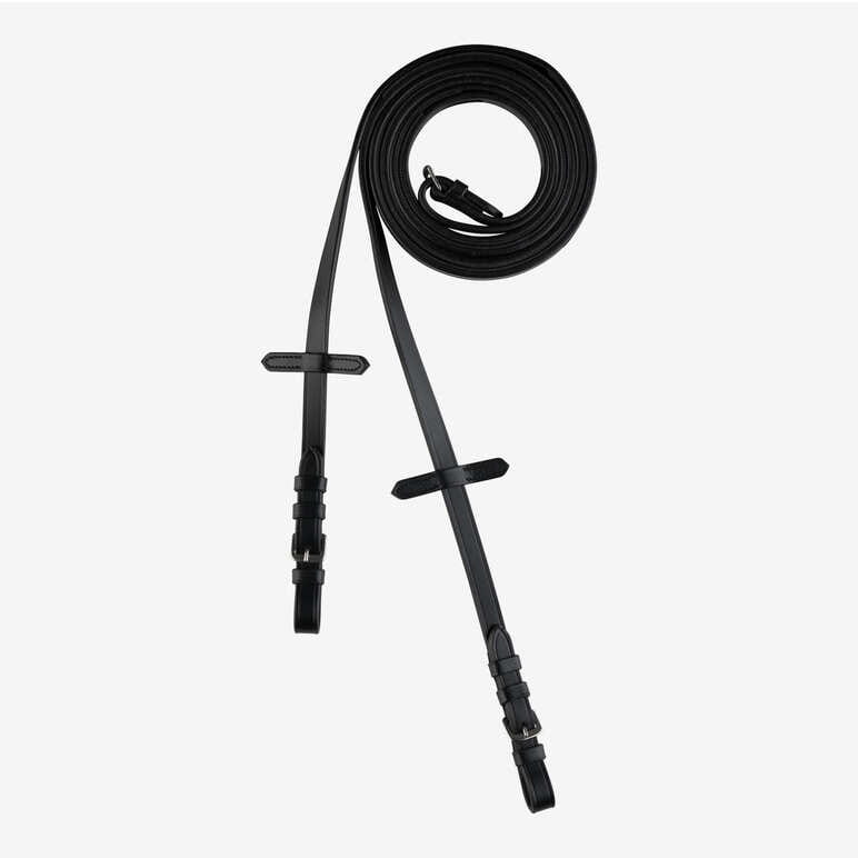 Te smukłe wodze są wykonane ze skóry z gumą po wewnętrznej stronie, która zapewnia łatwe czyszczenie i pewny chwyt. Klamry ze stali nierdzewnej są trwałe i łatwe do dopasowania do każdej uzdy.