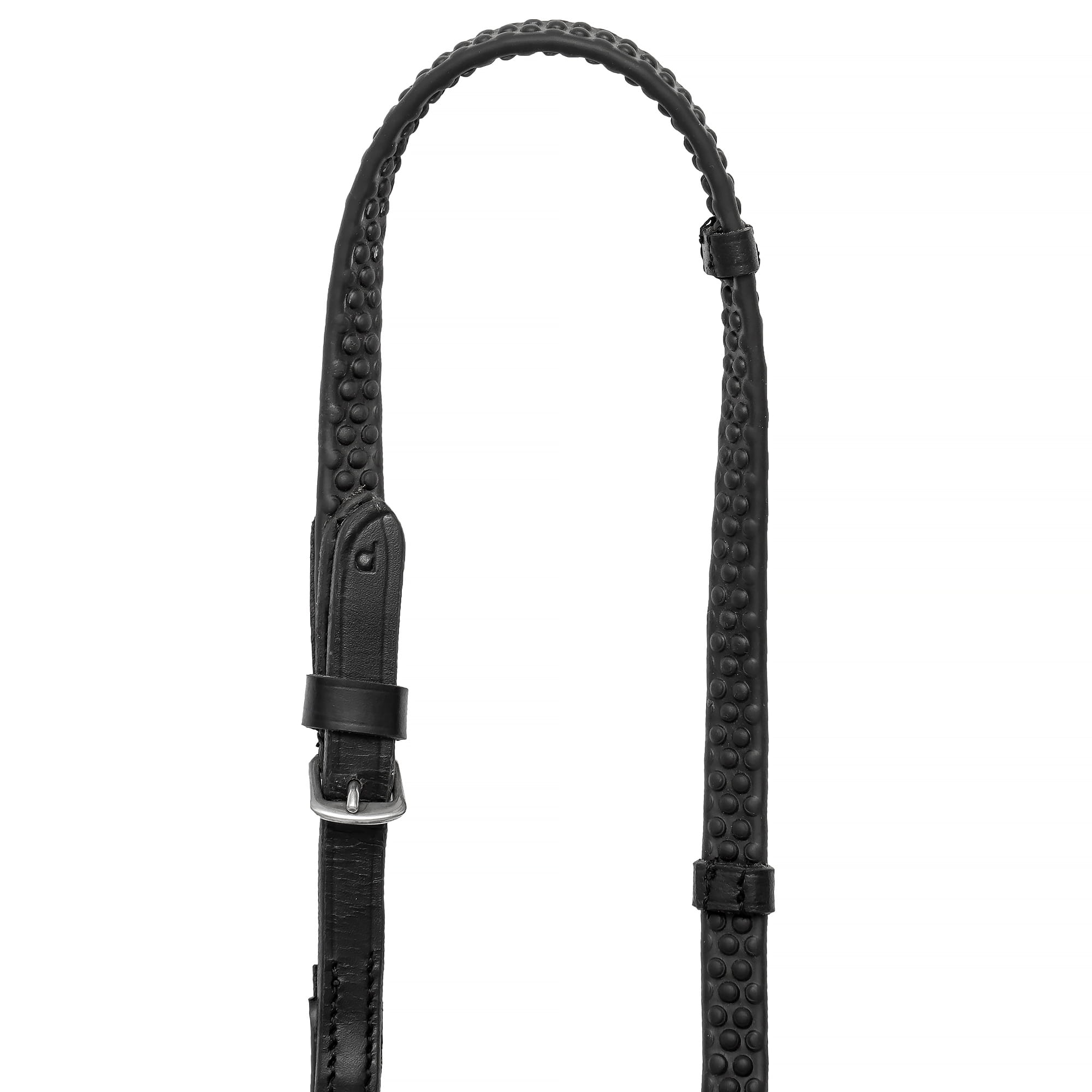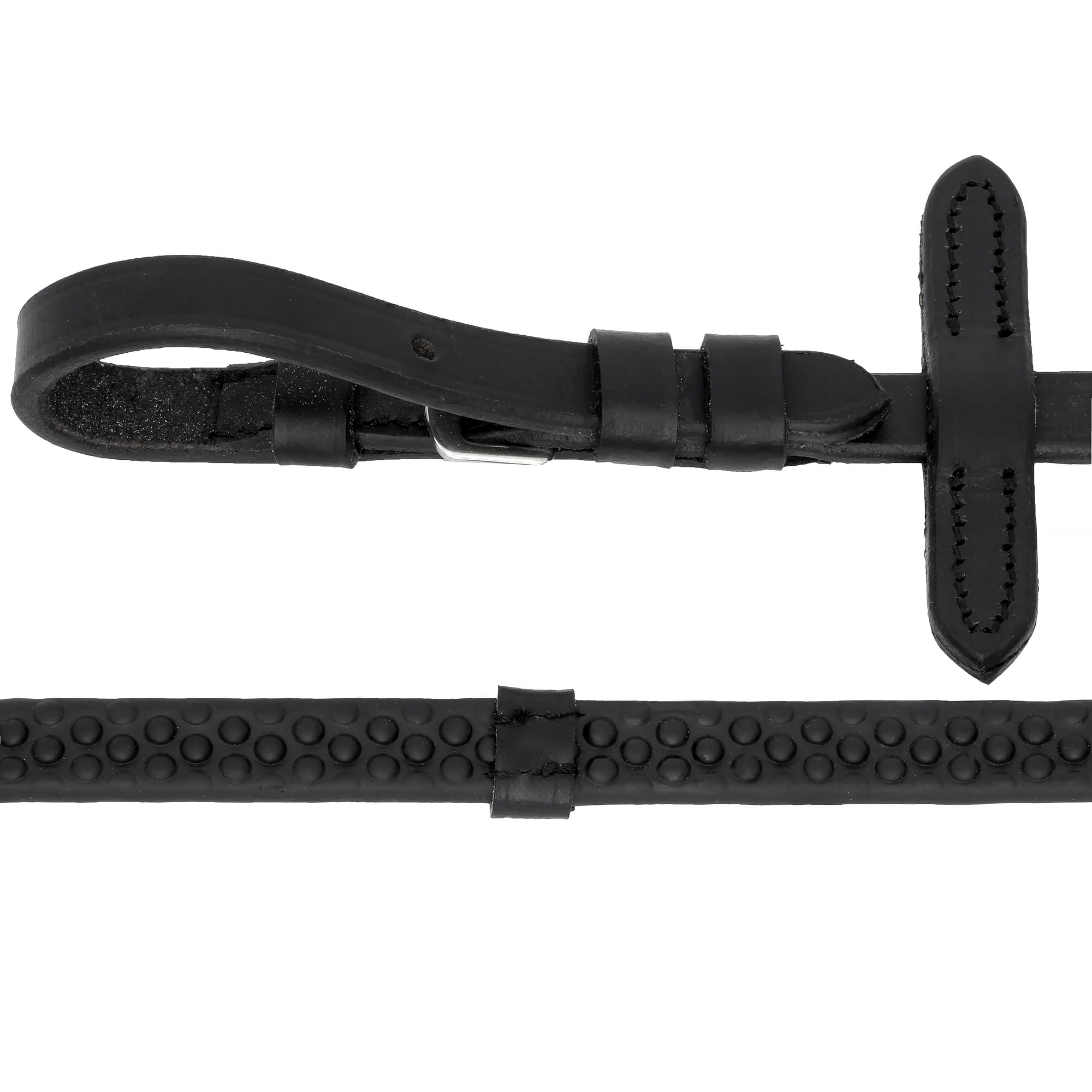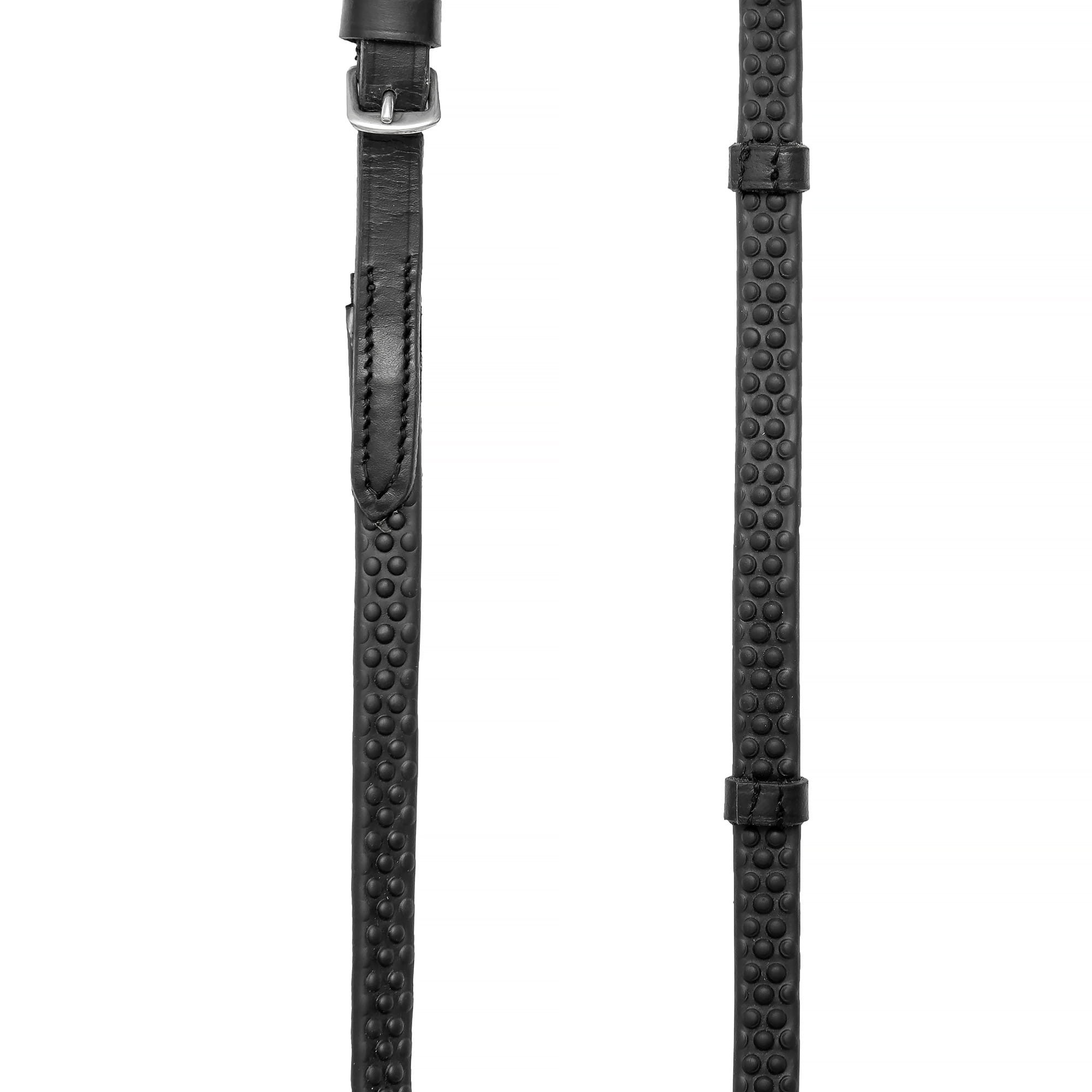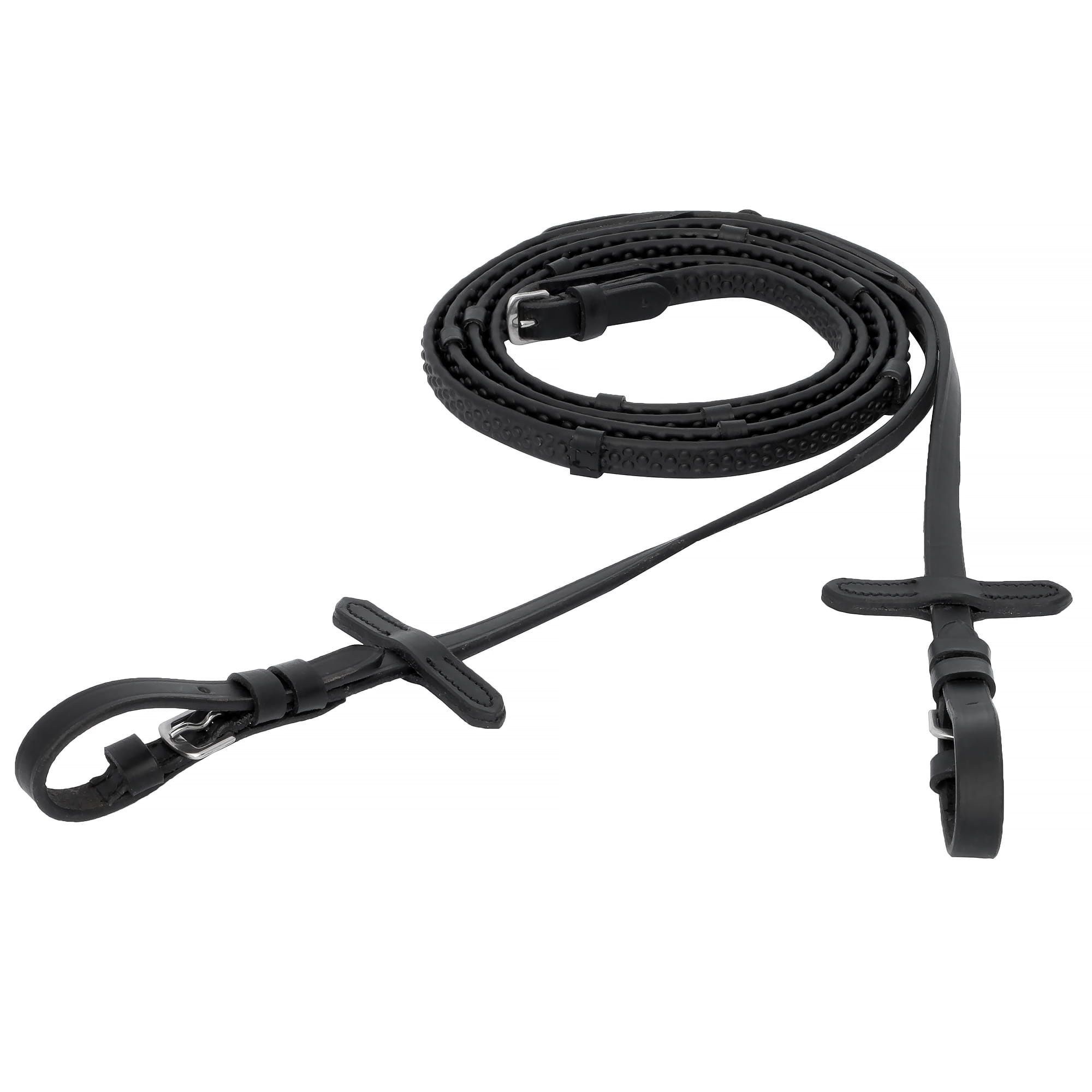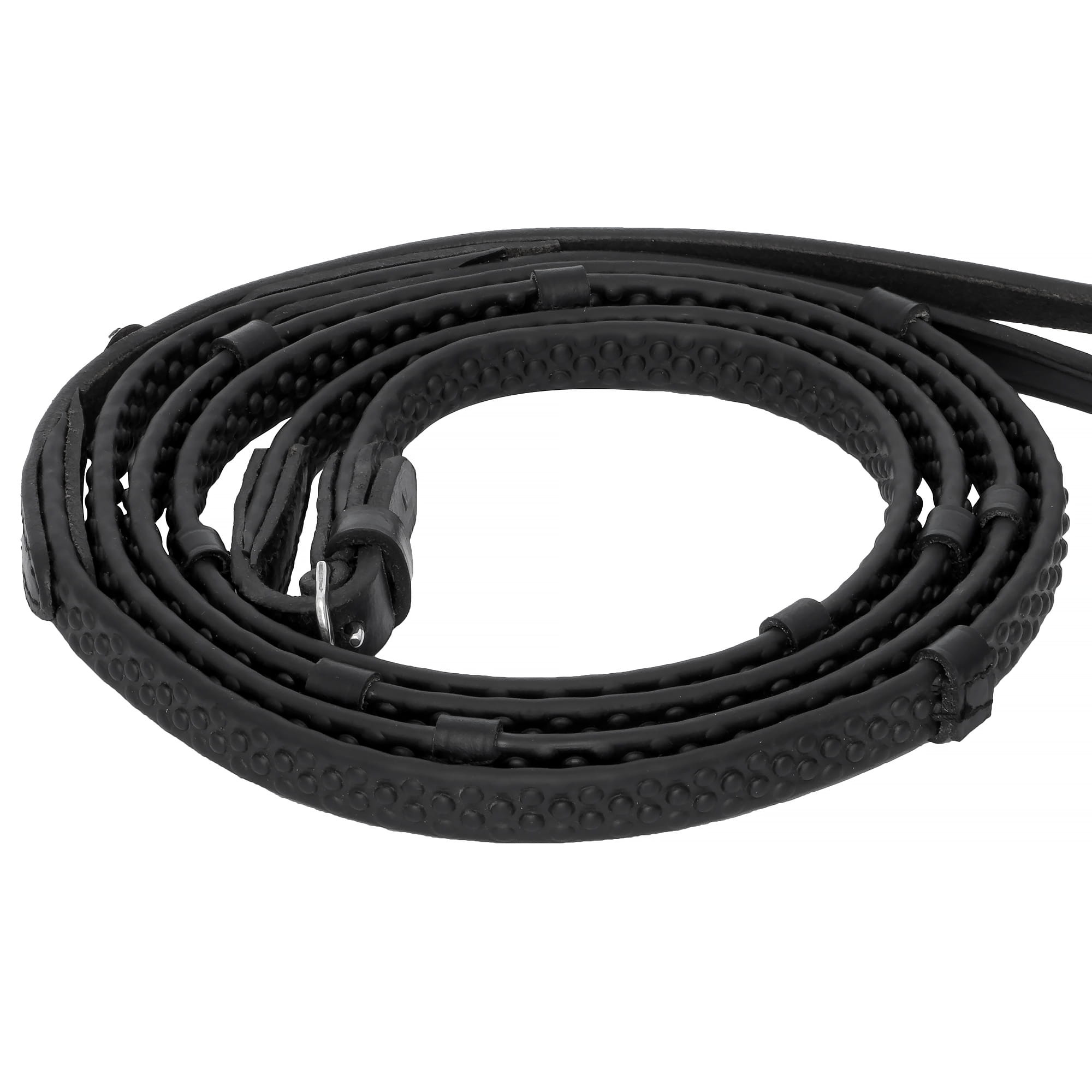 Funkcjonalne i wygodne wodze, które zapewniają pewny chwyt i komfort podczas jazdy. Wykonane z wysokiej jakości gumy z charakterystyczną wypustkową strukturą typu pimple, która zapobiega ślizganiu się w dłoniach i gwarantuje stabilne prowadzenie konia nawet w trudnych warunkach pogodowych. Szerokość wodzy wynosi 13 mm, dzięki czemu są wygodne w użytkowaniu.